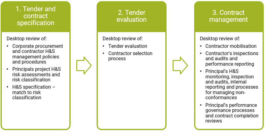 Our approach for reviewing an organisation’s contractor H&S management system involves examining the effectiveness of the organisation’s processes for the management of H&S risks associated with the use of contractors over the life cycle of a contract, which can include the following key events: